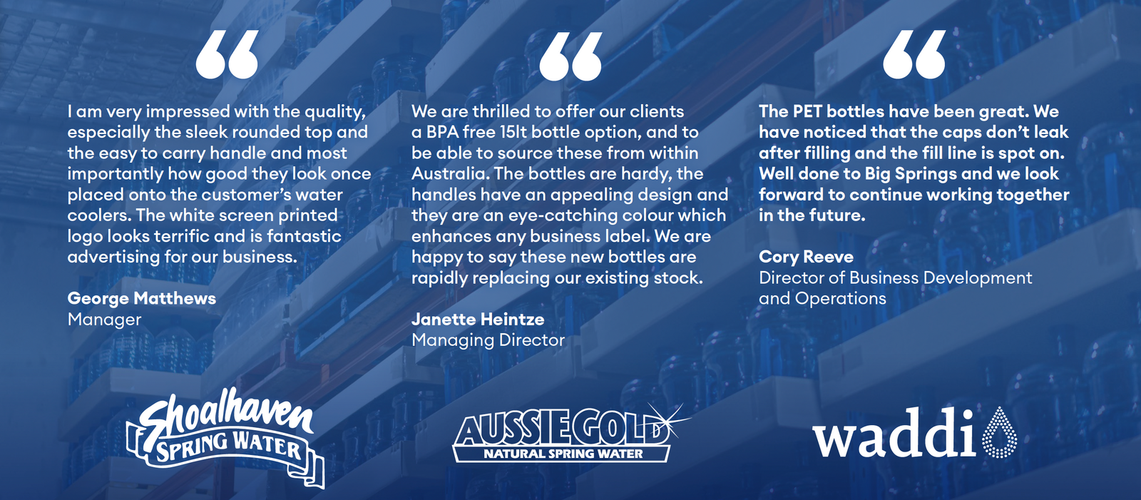 With over 25 years of experience in the water industry, we designed our returnable PET bottles to optimise their financial return by combining functionality, durability and aesthetics. Our bottles are designed to seamlessly integrate with existing filling and washing machines. Proudly family owned and operated we would like to thank you for your support.